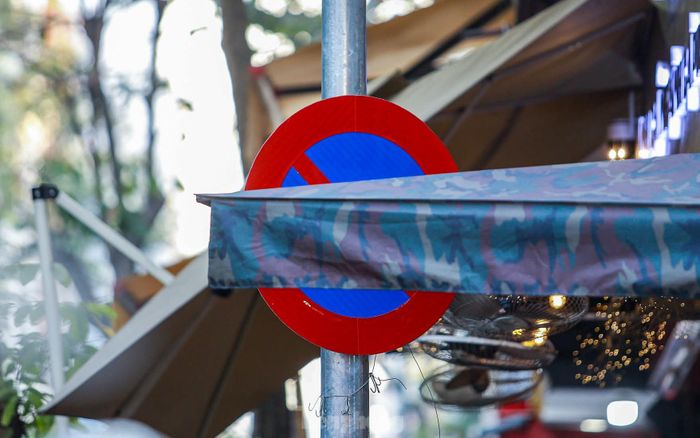 Tại đường Trần Quốc Hoàn (quận Cầu Giấy), một hộ kinh doanh đặt ô che khuất biển chỉ dẫn, gây cản trở tầm nhìn của người tham gia giao thông.