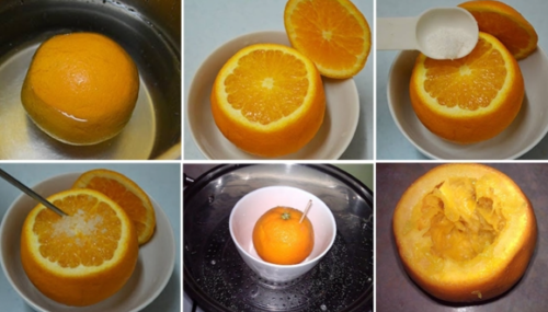 Cách làm: Rửa sạch cam và ngâm nước muối trong 20 phút sau đó cắt phần đầu, rắc 1 chút muối lên phần thịt quả lộ ra ngoài. Đậy nắp cam đã cắt lại, cho vào tô, cho vào nồi hấp cách thủy 15 phút là có thể dùng được.