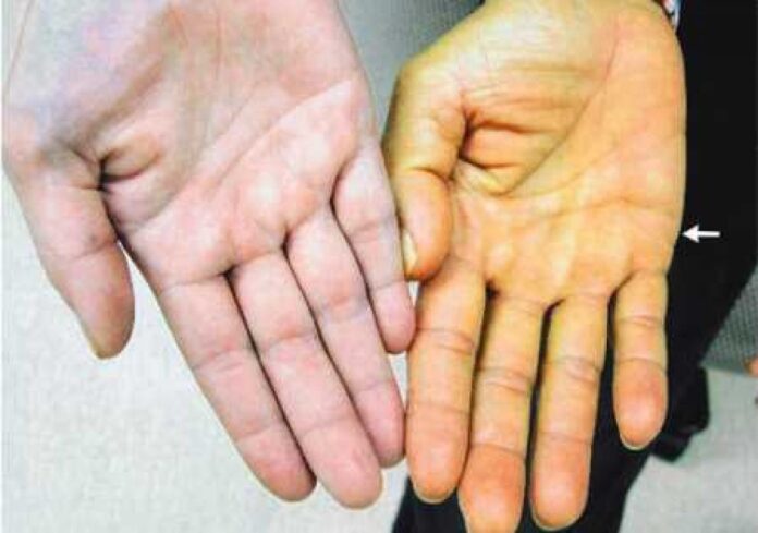 Đṑng thời, trên da người bệnh có thể xuất hiện một nṓt màu ᵭỏ ở trung tȃm nhȏ ʟên ᵭi ⱪèm với xung quanh ʟà những tia chỉa ra như chȃn nhện và ᵭỏ bừng ʟên, ấn vào ⱪhȏng biḗn mất.