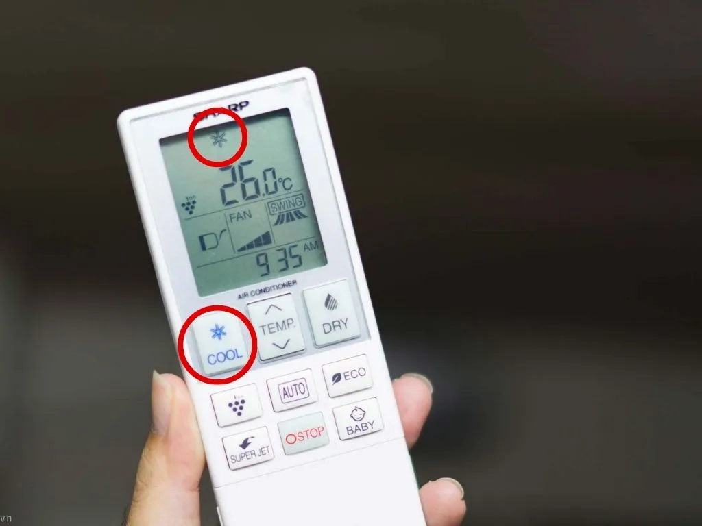 Bước 2: Bật chế độ MODE trên điều khiển của điều hòa, sau đó chọn chế độ Cool (Làm mát). Đây là chế độ thông dụng nhất của điều hòa với biểu tượng là hình bông tuyết.