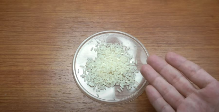 Tiếp đó, cho xi măng vào bát gạo và trộn đều. Hãy đảm bảo các hạt gạo đuề được phủ kín xi măng.