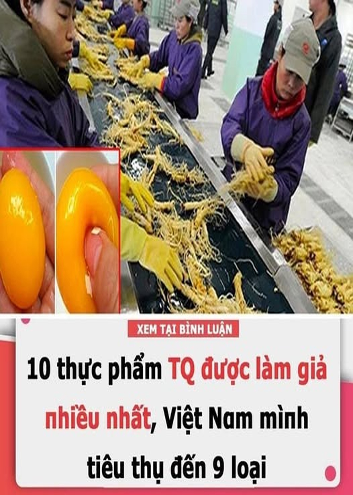 Ngay cả món thực phẩm quen thuộc và đơn giản nhất trong đời sống như trứng gà cũng bị làm giả ở Trung Quốc. Loại trứng này đã xuất hiện trên thị trường, có vẻ ngoài giống hệt trứng thật. Vỏ trứng làm từ canxi cacbonat, lòng trắng trứng gồm thành phầm chứa tinh bột, nhựa và chất làm đông, còn lòng đỏ có các phụ gia. Khi luộc chín, trứng gà giả ném xuống đất giống như quả bóng cao su.