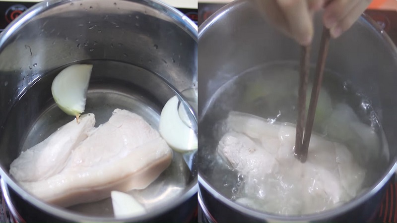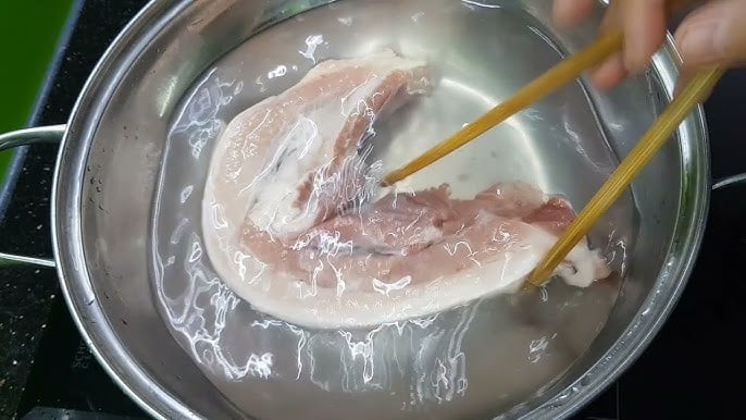 Thêm chút muối vào nồi nước đủ ngập thịt, cho thịt lợn đã rửa sạch vào đun lửa vừa, khi nước bắt đầu sôi thì bắc xuống, đổ bỏ nước, rửa lại thịt rồi mới bắt đầu luộc. Thêm vào nồi nước ít muối, giấm, hành đập dập để khử mùi.