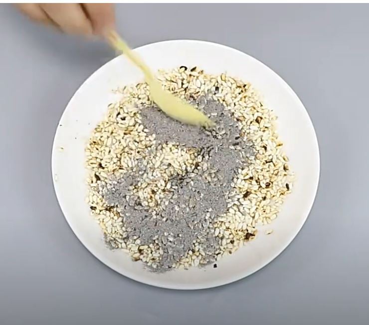 Đổ gạo ra bát và để nguội. Thêm một thìa dầu mè và một thìa xi măng vào bát gạo rồi trộn đều.